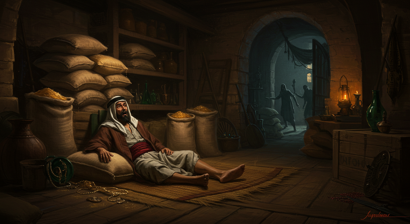 بعد فترة، جا التاجر يفتح المخزن، ويدوّر كيس الدراهم، ما لقى له أثر، واستغرب! المخزن مفتاحه بيده، وما يدخله إلا هو، وآخر واحد نام فيه هو هالرجال، فتيقّن إنه هو اللي أخذ الدراهم، ولا فيه أحد غيره يقدر يسرقهن.